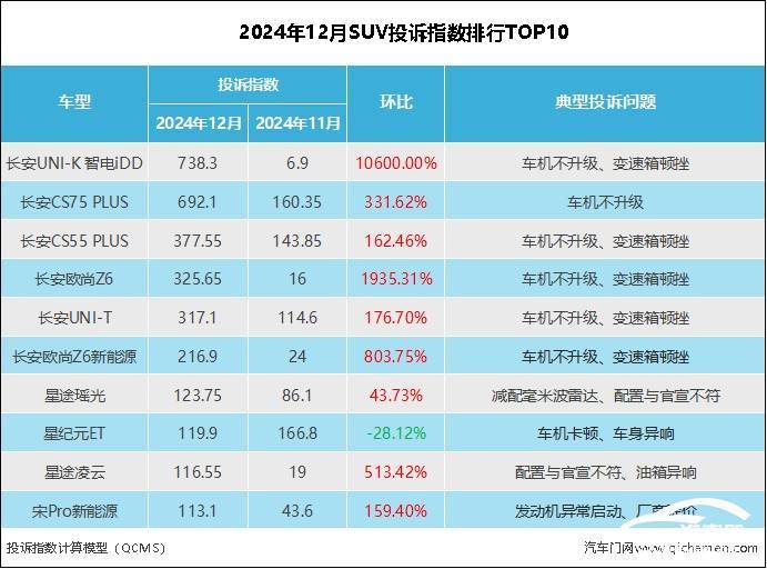 近期,汽車門網公布了2024年12月份的投訴指數報告,數據顯示SUV車型的投訴指數達到了7806.35,相比前一個月有了顯著的增長。值得注意的是,本月投訴榜單的前十名全部被中國本土汽車品牌占據,其中長安和奇瑞兩大品牌尤為突出,幾乎“壟斷”了整個榜單。而以往常居投訴榜前列的比亞迪,此次僅有宋Pro一款車型上榜,且位置滑落至第十。