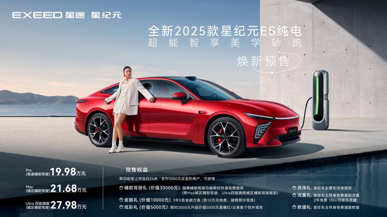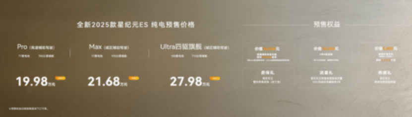 星途不但積極布局未來,對于現有產品也不斷迭代升級。繼星紀元ES增程版3月上市即熱銷之后,星紀元ES產品家族再次迎來重磅升級。發布會上,星途正式開啟了全新2025款星紀元ES純電車型的預售,預售價格19.98萬元-27.98萬元。
